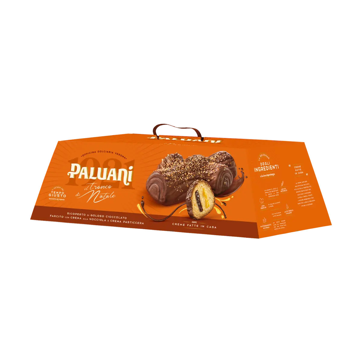La exclusiva forma del tronco navideño Paluani, relleno de crema de avellanas y crema pastelera. Cubierto de chocolate y decorado con migas de amaretto.